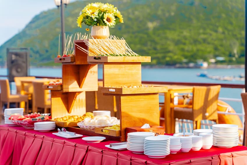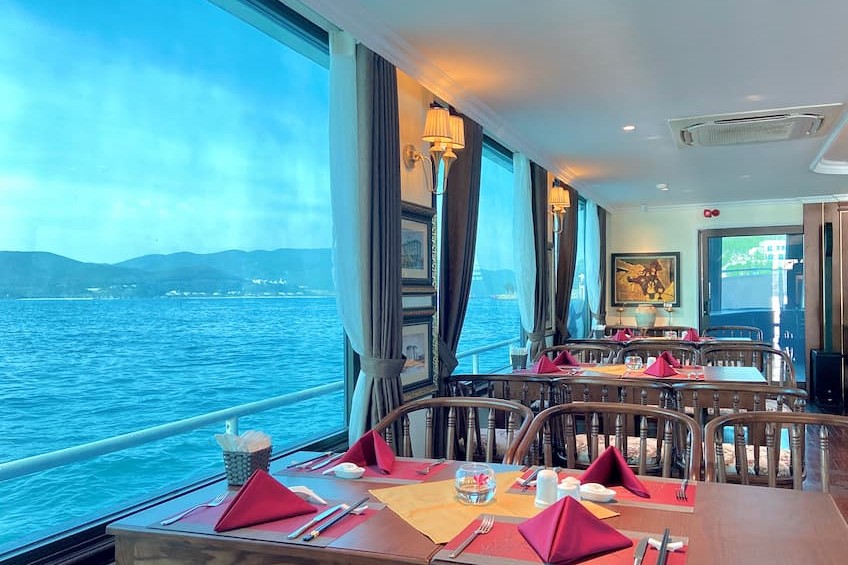 Quý khách ăn tối. Trải nghiệm cảm giác dễ chịu khi thưởng thức bữa tối thịnh soạn với âm nhạc và sự phục vụ ân cần của đội ngũ nhân viên Emperor Cruises.