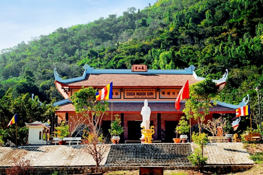 Di chuyển từ bến trung tâm thành phố Nha Trang đi theo đường Lê Hồng Phong rẽ vào đường Phong Châu đến xã Phước Đồng chúng ta sẽ được tham quan ngôi chùa hiện là điểm mà đa số các bạn trẻ ở Nha Trang tìm tới. Đó là chùa Nghĩa Sơn một trong những ngôi chùa có công trình được lấy ý tưởng từu kiến trúc Nhật Bản ở Nha Trang.