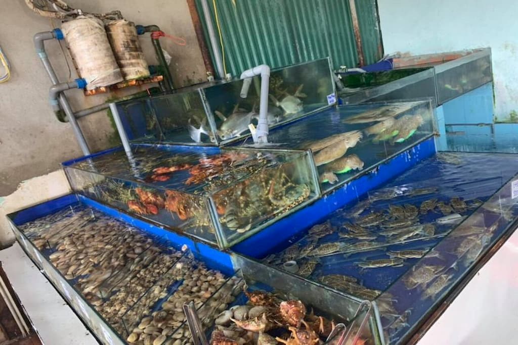Hình thức thưởng thức hải sản mà được nhiều người thích đó chính là tới những bè của người dân nuôi trực tiếp ăn tại đó luôn bao tươi. Đến với các khu Làng Chài bạn sẽ tự chọn những con mà mình cảm thấy ưng ý nhất, rồi sau đó người dân sẽ chế biến ngay với giá bình dân.