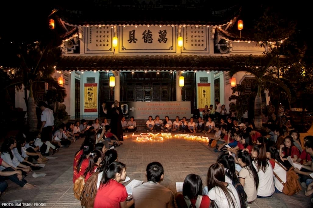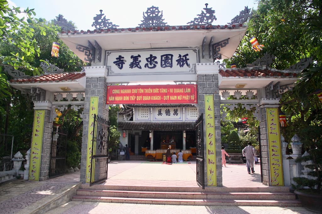 Hiện đến thăm chùa chúng ta sẽ có hai đường đi lên một là đường đi bộ bạn có thể di chuyển bằng thang bộ hoặc thang máy đều được. Du khách vãng cảnh chùa bước lên những bậc tam cấp rộng và dài, hai bên có bờ thành được trang trí thêm những bức tranh bằng đá mài, xen kẽ với những bệ trụ có chóp hình búp sen thật trang nhã. Du khách có thể dừng chân đọc và nghiền ngẫm những câu Kinh Pháp Cú tuyệt diệu mà thật gần gũi được khắc trên những tấm đá mài... ngôi Chánh điện mái cong trên thềm cao hiện ra trươc mắt với mái ngói rêu phong ,các con rồng uốn lượn trên nóc chầu pháp luân và hai tháp nhỏ thấp thoáng nhô lên hai bên nóc điểm xuyết themm cho vẻ cổ kính thiêng liêng. Trước thêm chánh điện là tượng hai con sư tử bẳng đá màu xanh thật hai bên tả hữu, bên phải ở góc sân là tượng Di Lặc Phật thật lớn được sơn thep vàng trên hòn non bô. Đối xứng về phía trái của ngài là tượng Văn Thù Sư Lợi bồ tát cạnh cây đa cổ thụ trên trăm năm tuổi.