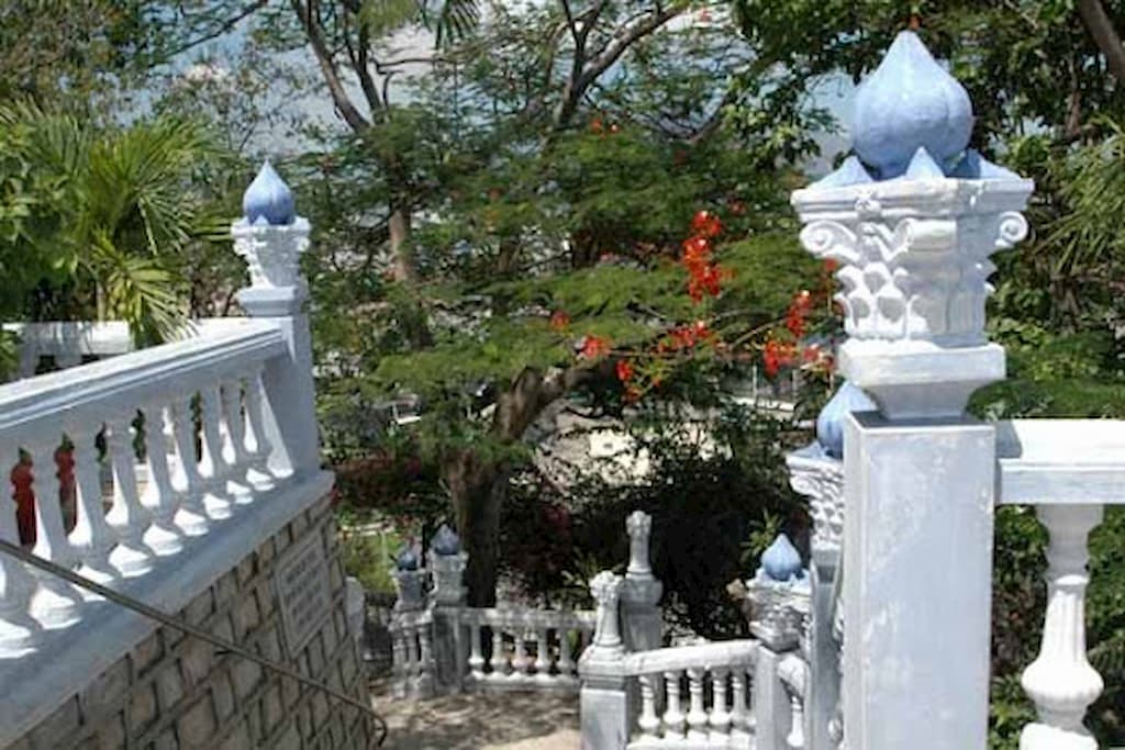 Vòng ra phía sau chánh điện bước qua một cây cầu ta sẽ thấy tháp chuông sáu trụ nằm giữa những cậu cây cảnh được bài trí hai hòa chen lẫn với những cây bồ đề xanh rì rào và phượng vĩ đỏ lòe hoa những ngày hè. Tiếp đến là tượng bồ tát Quan Âm lộ thiên với dáng vẻ thanh thoát diẹu hiền nhìn về biển đông sóng vỗ. Tận cùng sân sau của chùa là khu vực ô linh cốt thiết kế như những chung cư nhỏ, có mái che lớp ngói hồng bao lại xung quanh điẹn thờ bồ tát Địa Tạng.